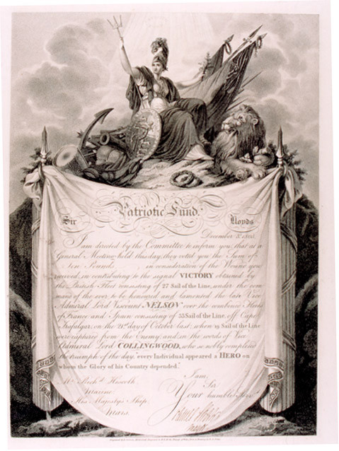 Lloyd's Patriotic FundThe Lloyd's Patriotic Fund originated at a meeting of the subscribers to Lloyd's Coffee-house, held on the 20th July, 1803. The object is explained in the third resolution : "That to animate the efforts of our defenders by sea and land, it is expedient to raise by the patriotism of the community at large, a suitable fund for their comfort and relief - for the purpose of assuaging the anguish of their wounds, or palliating in some degree the more weighty misfortune of the loss of limbs - of alleviating the distresses of the widow and orphan - of smoothing the brow of sorrow for the fall of dearest relatives, the props of unhappy indigence or helpless age - and of granting pecuniary rewards, or honourable badges of distinction, for successful exertions of valour or merit." To set an example to the public bodies throughout the United Kingdom, they opened a subscription for the relief of those sufferers and their families who might be injured or sustain loss during the war, when, independently of individual subscriptions, they voted £20,000 from the funds of the House. In a fortnight there was added to this £70,312 7s 0d by individual members, which formed the foundation of the Patriotic Fund. By March 1804, the Fund had received over £174,000. Men, Officers and Marines who were wounded received a sum of money related to their rank/rating and the severity of their wounds: