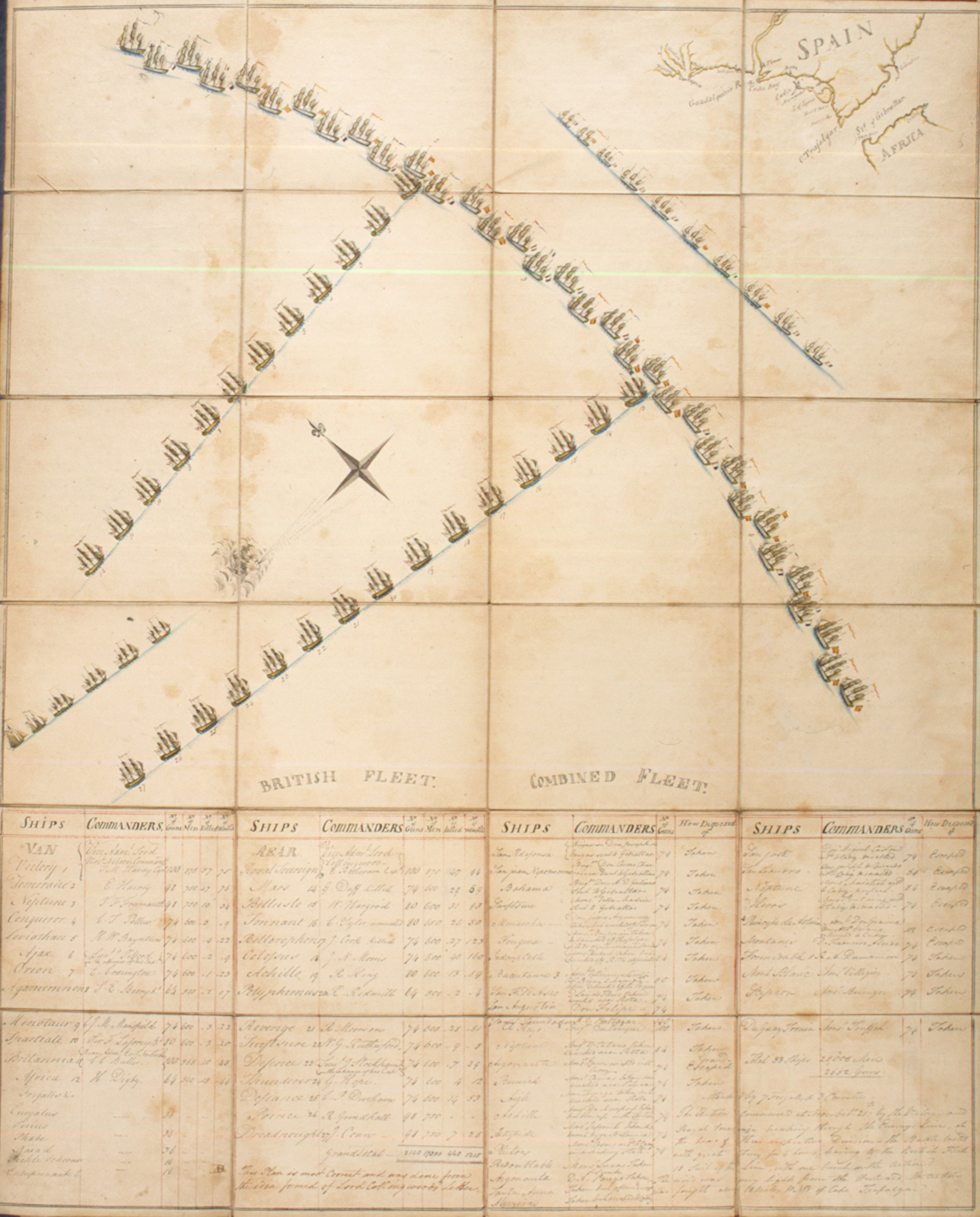 At first the Combined fleets headed South East towards Gibraltar but later turned North West back towards Cadiz. With light winds and inexperienced crews the fleet was not in the planned formation of two parallel lines but was spread out over 5 miles.