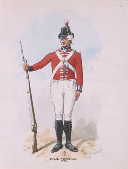The age is not generally given in the musters. We have, wherever possible, collected the information from the Marine Description Books (ADM158), where we have been able to calculate the approximate age in 1805 from the enlistment date and the age at enlistment. Unfortunately it has not been possible to find all the men in the description books because some books have not survived and some musters do not record sufficient information to positively identify the individual. Matters are further complicated by the major changes in the divisions and companies that occurred in 1802. Sometimes we have found that the age given elsewhere e.g. Chatham Chest or Greenwich Hospital does not match that given in the description book, in these cases we have retained the muster age but listed the alternative as well.