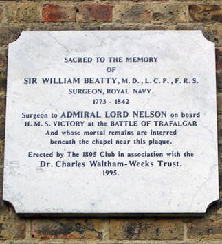 A white marble plaque dedicated to Nelson's chief surgeon on board the flagship "Victory" at Trafalgar.