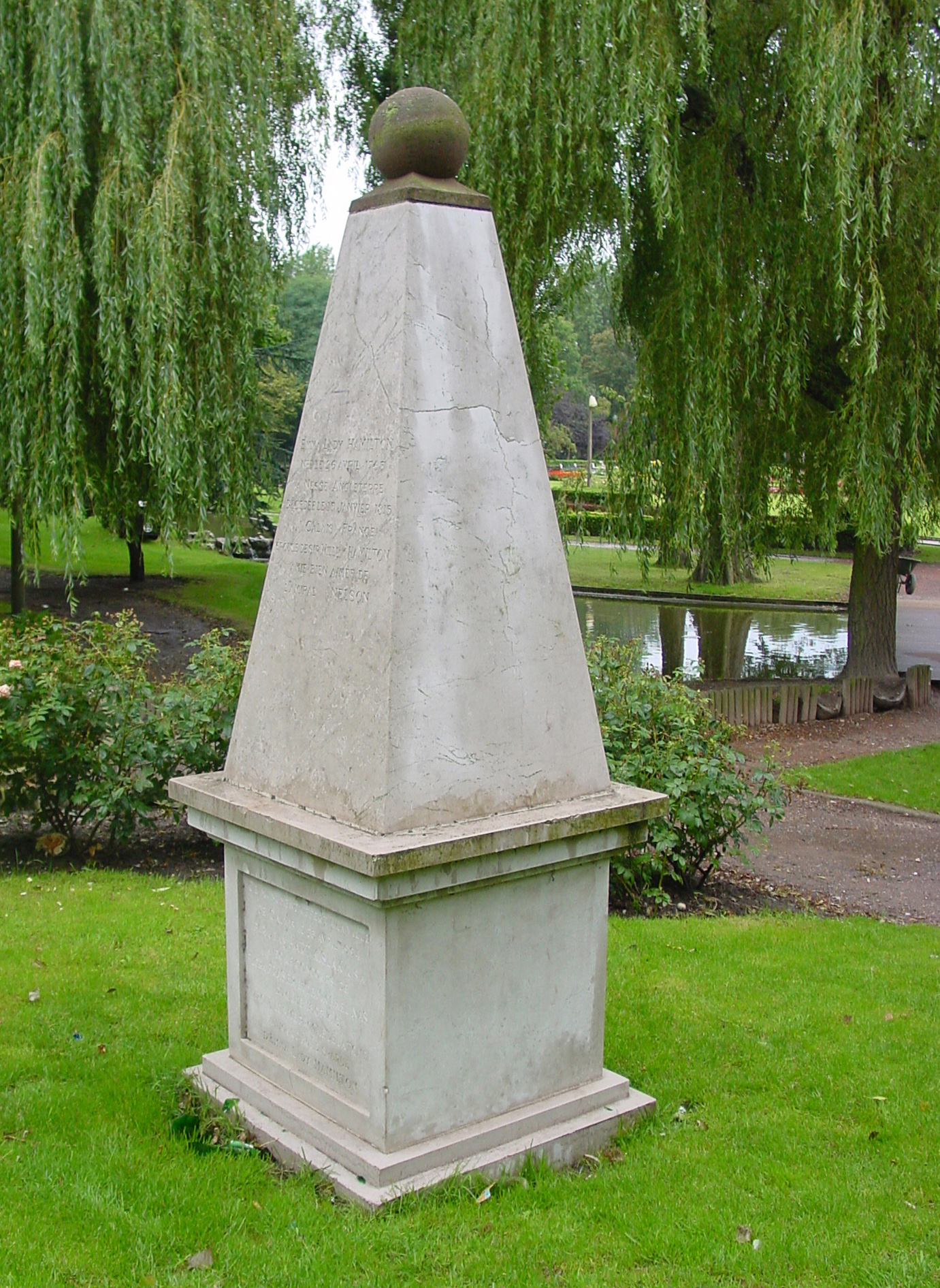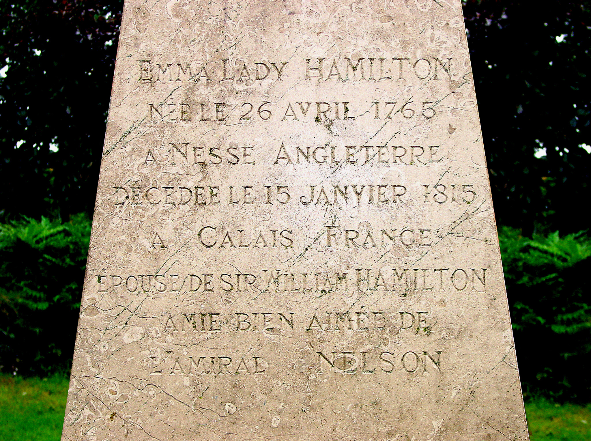 This monument generously donated on April 23rd 1994to the town of Calais by Jean Hart Kislak (USA) with the assistance of Flora Fraser and Michael Nash of The 1805 Club (UK) marks the approximate site of Emma, Lady Hamilton's original burial place.