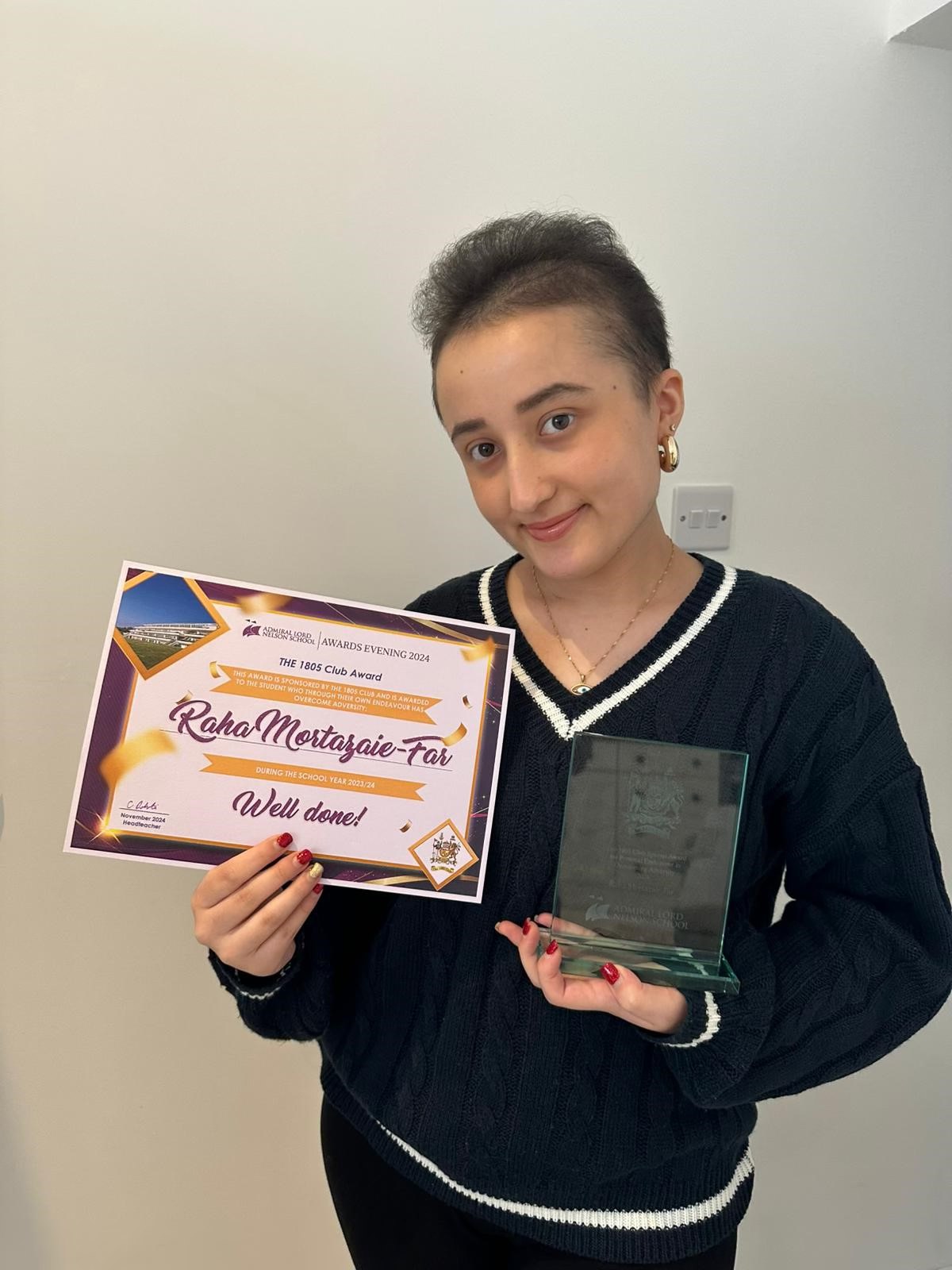 On Thursday 28 November, at the annual Awards Evening of Portsmouth’s Admiral Lord Nelson School (ALNS), RAHA MORTAZAIE-FAR (17) received The 1805 Club’s ‘Special Award for Personal Endeavour in Overcoming Adversity’.