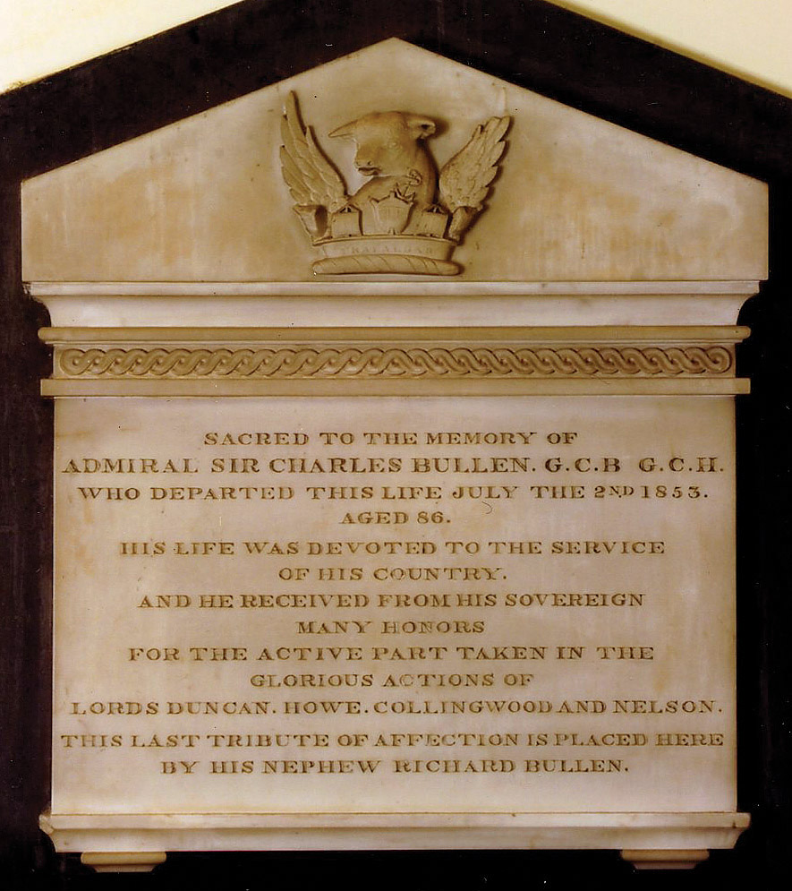 Note: In addition, St James’s Church, Shirley holds on its north staircase a large diamond-shaped painted hatchment of Sir Charles Bullen, inscribed ‘Trafalgar’, ‘Tria juncta in uno’ and ‘A rege et Victoria’.