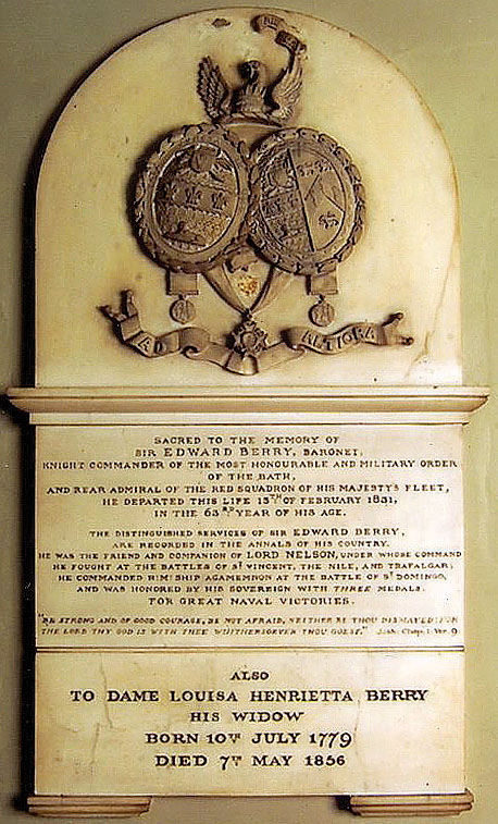 sir EDWARD BERRY, baronet, knight commander of the most honourable and military order of the bath, and rear admiral of the red squadron of his majesty’s fleet, he departed this life 13th of february 1831, in the 63rd year of his age.