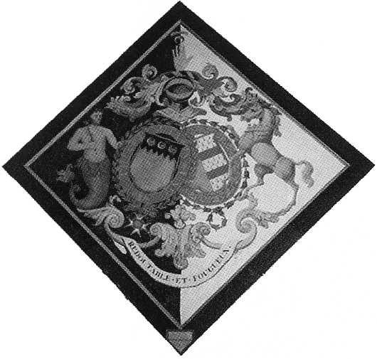 Description: A diamond-shaped coat of arms, with two shields flanked by Neptune and a unicorn. At the very top is the word ‘Temeraire’, and below ‘Redoutable et Fougueux’.