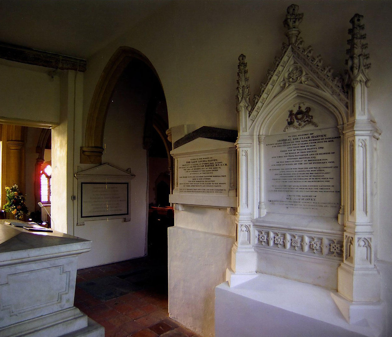 Description: The inscription is flanked by two columns topped by crocketed pinnacles. Above is an arch containing a coat of arms with Neptune and a unicorn. Above the arms is the word ‘Temeraire’ and below ‘Redoutable et Fougeux’.