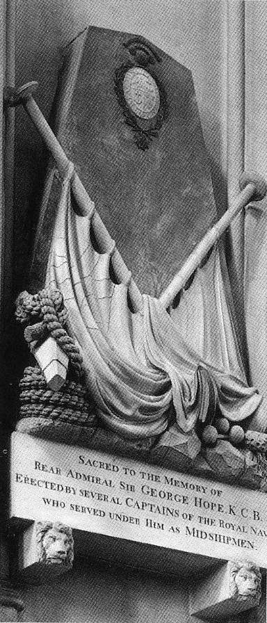 Note: Erected 1820 at a cost of £150. The Admiral was in fact buried a little distance away in the middle aisle of the nave on 9 May 1818, but his actual grave is now covered by the later brass to Sir George Gilbert Scott.
