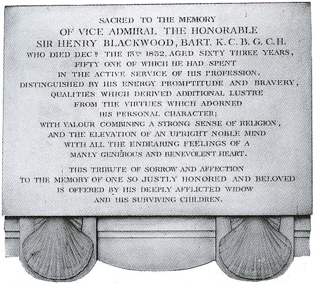 In white marble against a grey marble background, with two scallops below. Sculptor: W. Behnes.