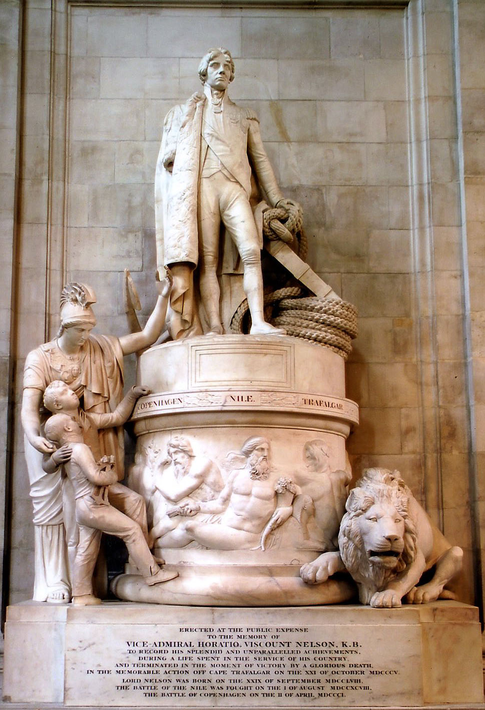 Description: A large marble statue of Nelson in the undress uniform of a vice admiral, with four orders on his left breast and two medals round his neck. His Turkish ‘pelisse’ is draped over his right shoulder and his left hand rests on an anchor and coil of cable. The statue stands on a plinth bearing the names of his battles: COPENHAGEN, NILE, TRAFALGAR, and a bas relief of three reclining sea gods. On the left side Britannia points out Nelson to two boys dressed as midshipmen, and on the right is a mourning lion.