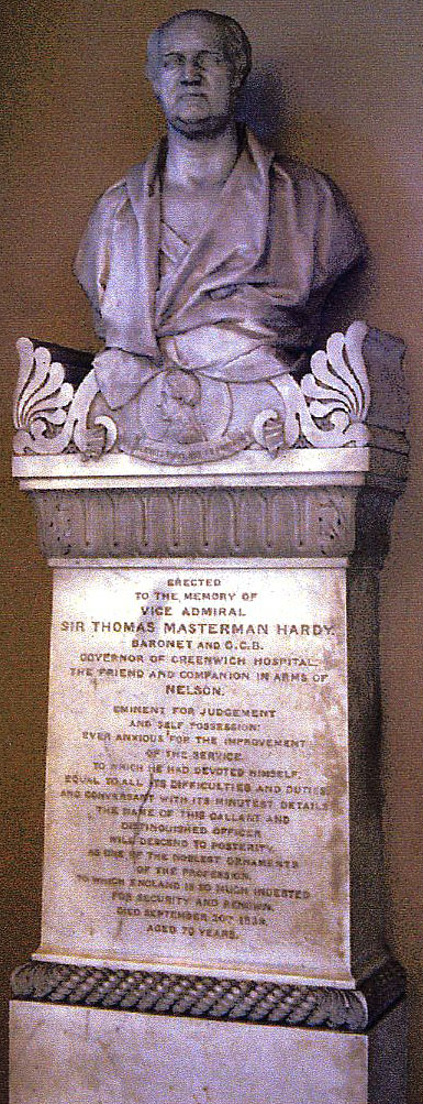 Description: Made of white marble in 1843, a bust of the head and upper torso of Hardy, without arms, with an inscription below, and the whole standing on a low plinth.