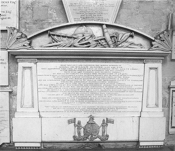 Description: A marble wall plaque, with an inscription flanked by two pillars and topped by a low arch containing various naval emblems, eg anchor, globe etc. Below the inscription is a coat of arms with two figures bearing flags inscribed ‘Belleisle’ and ‘Trafalgar’.