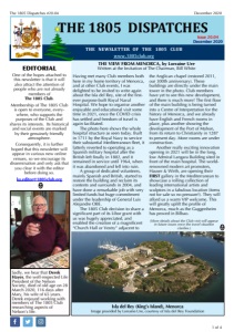 The 1805 Dispatches #20.04 December 2020 1 of 4 EDITORIAL One of the hopes attached to this newsletter is that it will also attract the attention of people who are not already members of The 1805 Club. Membership of The 1805 Club is open to everyone, everywhere, who supports the purposes of the Club and shares its interests. Its historical and social events are marked by their genuinely friendly atmosphere. Consequently, it is further hoped that this newsletter will appear in various new online venues, so we encourage its dissemination and only ask that you clear it with the editor before doing so. ka.editor@1805club.org THE 1805 DISPATCHES Issue 20.04 December 2020 THE VIEW FROM MENORCA, by Lorraine Ure Written at the Invitation of The Chairman, Bill White Having met many Club members both here in my home territory of Menorca, and at other Club events, I was delighted to be invited to write again about the Isla del Rey, site of the firstever purpose-built Royal Naval Hospital. We hope to organise another enjoyable and educational visit some time in 2021, once the COVID crisis has settled and freedom of travel is again facilitated. The photo here shows the whole hospital structure as seen today. Built in 1711 by the Royal Navy to service their substantial Mediterranean fleet, it latterly reverted to operating as a Spanish military hospital after the British left finally in 1802, and it remained in service until 1964, when it was abandoned and fell into ruin. A group of dedicated volunteers, mainly Spanish and British, started to restore the building and reclaim its contents and surrounds in 2004, and have done a remarkable job with very limited funds but huge commitment under the leadership of General Luis Alejandre OBE. The 1805 Club decision to share a significant part of its Libor grant with us was hugely appreciated, and enabled the creation of a magnificent “Church Hall or Vestry” adjacent to the Anglican chapel (restored 2011, our 300th anniversary). These buildings are directly under the main tower in the photo. Club members have yet to see this new development, and there is much more! The first floor of the main building is being turned into a Centre of Interpretation for the history of Menorca, and we already have English and French rooms in place, plus another showing the development of the Port of Mahon, from its return to Christianity in 1287 to present day. More rooms are under construction. Another really exciting innovation opening in 2021 will be in the long, low Admiral Langara Building sited in front of the main hospital. The worldrenowned modern art promoters, Hauser & Wirth, are opening their FIRST gallery in the Mediterranean to showcase a rolling collection of leading international artists and sculptors in a fabulous location (items not for sale so no pressure!). They will afford us a warm VIP welcome. This will greatly uplift the profile of Menorca, much as the Guggenheim has proved in Bilbao. (More details about the Club visit will appear in future issues once the travel situation clarifies.) Sadly, we hear that Derek Hayes, the well-respected Life President of the Nelson Society, died of old age on 28 March 2020, 116 days after Mary, his wife of 65 years. Derek enjoyed working with members of The 1805 Club researching aspects of Nelson’s life. Isla del Rey (King’s Island), Menorca Image provided by Lorraine Ure, courtesy of Isla del Rey Foundation THE NEWSLETTER OF THE 1805 CLUB www.1805club.org