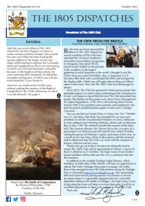 1 of 6 October 2023 The 1805 Dispatches #23.05 THE 1805 DISPATCHES THE VIEW FROM THE BRIDGE From The Chairman, Capt. John Rodgaard USN (Ret) By the time you have received this edition of The 1805 Dispatches, several members of The Club have attended the US Naval Academy's McMullen Naval History Symposium in Annapolis, Maryland. This biannual event, hosted on the grounds of the academy, is the largest gathering of naval historians in the world. I thought it was The Club's most successful McMullen, due, in large part, to US Secretary Pete Stark who coordinated the effort and arranged for the display table. I think you will agree after reading our Editor's report in this issue. Also visit The 1805 Club Face Book page for photos. Since 2015, The Club has sponsored a three-person panel who presented papers on various topics pertaining to the Georgian era of sail. I am happy to report that this year The Club sponsored two panels. The themes for the panels were, Royal Navy Management of Captive Populations, 1793-1815 and Learning about Navies. Several 1805 Club members were panelists and moderators. We look forward to publishing their papers in next year's Trafalgar Chronicle. You can see that our Events Diary is a busy one. On 7 October our U.S. Secretary, Pete Stark, has arranged for our east coast members to visit the Zwaanendael Museum at Lewes, Delaware to view artefacts from HM Brig DeBraak, which sank in Delaware Bay in May 1798. The artefacts include the remains of the brig's hull. The museum director, Ms. Devon Filicicchia, is to give us a presentation on DeBraak and will lead the tour, which includes visiting the graves of DeBraak's captain and many of her crew. As a result of our visit, Pete will be in discussions with the museum staff to determine how The Club can work with the museum to honour DeBraak and her crew. Thanks also go out to Barry Scrutton for taking the lead to ensure The 1805 Club will be represented at Nelson's crypt in St Paul's Cathedral on 21 October. I do hope many of our Londonbased members will be able join him. It is a ceremony that stirs the emotions. In addition to the multiple Trafalgar Night Dinners, which members on both sides of the Atlantic will have an opportunity to attend, The Club's Trafalgar Way project manager, Ms. Kathy Brown has arranged to have The Salts perform along the Trafalgar Way in November https://www.thesalts.co.uk/. This outstanding folk-rock band will be playing popular sea shanties at several locations where Lt. Lapenotiére stopped when he carried the dispatches telling of the Battle of Trafalgar. I do hope many of you living along the route will drop in to hear them play. It will be an excellent opportunity to show your support to The 1805 Club. Yours aye, Detail from The Battle of Camperdown By Thomas Whitcombe, 1798, Courtesy of The Tate (Public Domain) After the over-sized edition of The 1805 Dispatches last time (August) we return to nearer normal-sized this October. This is partly because your Editor has been hauling the autumn edition of The Kedge Anchor into shape whilst starting to organise the Cornwallis Memorial supplement to the KA for next spring, of which you will read elsewhere, and partly because, in the height of all that activity, he went swanning-off to Annapolis, to attend the McMullen Symposium, of which you will also read elsewhere, if you choose to. However, we could not let October pass without saluting the memory of the Battle of Camperdown, the 226th anniversary of which is on the eleventh. See page 4. EDITORIAL Newsletter of The 1805 Club