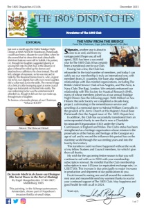 7 of 7 December 2023 The 1805 Dispatches #23.06 THE 1805 CLUB Founded in 1990, the Club: ・Promotes research into and education about the Royal Navy, merchant maritime service and other state navies of the same era; and ・Promotes and engages in the preservation of monuments and memorials relating to the Royal Navy and seafaring people of the later sailing-navy era; and ・Organises relevant cultural, historical and social events. The Club is charity No. 1201272, registered in England and Wales. Individuals desiring further information may contact: Stephen Howarth, Hon. Club Secretary, The 1805 Club Shelton, Notts, NG23 5JQ, UK Email: secretary@1805club.org Telephone: 01949 851346. For a membership application form please contact: Dr Sue Carr, Hon. Membership Secretary, The 1805 Club London, UK Email: membership.secretary@1805club.org Or: Harold E (Pete) Stark, Hon US Secretary, The 1805 Club Annapolis, MD, USA Email: the.americas.membership.secretary@1805club.org Telephone: 410-269-9760 (mobile) Or: Mark Billings, Hon Canadian Secretary, The 1805 Club Montreal, Quebec, Canada Email: canadian.membership.secretary@1805club.org Telephone: 1-514-296-1641 Peter Turner, Editor of The Kedge Anchor Aldeburgh, Suffolk, UK Email: ka.editor@1805club.org Telephone: +(44) 7903 251008 The Newsletter for Anyone Interested in The 1805 Club PURPOSE. The purpose of this newsletter is to support and advance the Club’s objectives. The newsletter provides anyone who is interested with brief items of news about the club and its activities, in the hope that the it can help the club attract wider interest in naval history and new members. Much of the content will be a précis of articles that will appear in The Kedge Anchor, the six-monthly club magazine. EDITORIAL POLICY. The Editor has full editorial responsibility for the newsletter. Views expressed in the newsletter are those of individual authors, unless claimed by the Editor. Articles which appear do not express the official position of The 1805 Club on any subject unless specifically noted as such. Content of contributions to the newsletter may be edited for grammar, space allocation, or to better serve the purpose of the newsletter. Contributors wishing to be alerted to editorial decisions should notify the Editor at the time that their contribution is submitted. Otherwise the submission will be published within the scope of the editorial policy. ISSUE AND COPY DATES The proposed issue dates for The 1805 Dispatches are: February, April, June, August, October and December. Anyone wishing to contribute an article or news item to the Editor for inclusion in the newsletter should do so by the middle of the month preceding the issue in which it is to be inserted. Any articles that are not time-specific can be submitted at any time, with a note advising the Editor of that fact. All copy is welcome, but not all copy may be used! Scorbutic, citrous, strobic, bistro, bruits, bustic, citrus, coitus, courts, crouts, cubist, cubits, orbits, rictus, robust, rustic, stucco, subito, succot, suitor, bruit, brust, burst, busti, coits, court, crits, crost, crust, cubit, curst, cutis, ictus, orbit, riots, roist, rosti, roust, routs, scout, stoic, stour, toric, torsi, torus, trois, tsubo, turbo, bist, bito, bort, bout, brit, brut, bust, buts, cist, cito, cost, crit, cuit, curt, cuts, obit, orts, otic, oust, outs, riot, rost, roti, rots, rout, rust, scot, scut, sort, stir, stob, stub, suit, tiro, torc, tori, tour, trio, trou. SHIP’S WORD WHEEL ANSWERS The term square meal is a naval term from the days of sailing ships. The main meal of the day would be eaten off a squareshaped wooden plate, which also served as the tray. A decent meal on board became known as a square meal. The illustration is of a square Christmas meal, this being the December edition of TD. NAVAL TERMS THAT HAVE ‘COME ASHORE’ PRYSTEN HOUSE, PLYMOUTH Club member Andrew Welch has suggested a future commemoration event for The 1805 Club, and the idea has generally received a favourable reaction from the Trustees. Meanwhile, for those of you within reach of Plymouth, here is some information about the venue. (Text and image edited from Plymouth Herald website) Located at the side of St Andrew's Church, on the Treasury roundabout in the Guildhall car park, is initially what looks like a gate to a bin store. This Catherine Street side entrance in fact takes you into a fascinating historical location in Plymouth. Prysten House. There is a tree bearing the plaque 'Hands across the Sea' which was planted in 1970 in commemoration of Mayflower delegates visiting from Massechusets. Further down the path, around one of the locked doors of Prysten House is an inscription which reads 'The Door of Unity'. The large stone step and accompanying plaques and memorials is said to have been installed in the memory of Americans William Allen and Richard Delphey who died in action in 1813 and whose remains lay to the left of the door. Allen was the Commander of the United States Brig Argus which ended up in battle with HMS Pelican, he went on to have a street, a fort and a destroyer named in his memory, the latter of which served at Pearl Harbour. PRYSTEN HOUSE, PLYMOUTH For those who could not be part of the fun, This Trafalgar Night Dinner was one special one. Pre-dinner reception was held in the bar, A fine time for chat with friends, near and far. The firework-show was enjoyed from the terrace, Chilly to watch, but a memory to cherish. The dinner was grand, with more talk across table, The ships and chocs passed and the port, formidayble. Then MP Penny Mordaunt rendered us a fine speech, As broad as we’d hoped for, and not at all niche. Ending back to the bar for some last-minute drinks, Then, thankfully, bed after all the high-jinks. Thank you to Stephen, to have failed would be tragic, To better this year you’ll have need of strong magic. FINAL WORD ON THE TND