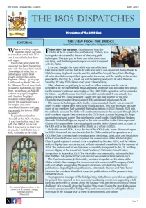 1 of 7 June 2024 The 1805 Dispatches #24.03 THE 1805 DISPATCHES THE VIEW FROM THE BRIDGE From The Chairman, Capt. John Rodgaard USN (Ret) Fellow 1805 Club members, I just returned from the Club’s AGM in London this past Saturday, 25 May, to a front garden dominated by dozens of blooming pink hydrangeas. That just goes to show you what seven days can bring, and that brings me to report on what transpired with the AGM. I, for one, thought this year’s AGM was one of the best. One reason for its success had to do with how well it was organized. Many thanks to Club Secretary Stephen Howarth, and the staff at The Army & Navy Club (The Rag). All who attended conveyed their approval of the venue, and the quality of the service provided by The Rag. As a result, we will be holding next year’s AGM at there on Saturday, 17 May 2025. Please mark your calendar/diary. Also, what was so gratifying to me and my fellow trustees was the vote of confidence by the membership (those attending and those who provided their proxy), for the trustees’ continued stewardship of The 1805 Club’s operation and its vision for the future. I say this because the AGM was a bit complicated. It was actually two AGMs: one for the Unincorporated Charity (the old) and another for the new Charitable Incorporated Organization (CIO), established at last year’s AGM. The reason for holding an AGM for the Unincorporated Charity was to retain it solely in order to keep open the charity’s bank account. This was necessary because many of our members had submitted their subscriptions in 2023 through 2024 into the old bank account. The Club will continue to maintain this account through 2024 until members migrate their renewals to the CIO’s bank account by using the Stripe payment-processing system. The membership voted to elect Mark Billings, Stephen Howarth, Nicholas Ridge and myself as the sole councillors to the Unincorporated Charity with responsibility for managing the transfer of the charity’s bank account to the CIO and for the dissolution of the charity as a whole in 2025. As for the second AGM, it was the first of the CIO charity. In my chairman’s report for 2023, I informed the membership that the Club conducted its operations as a CIO. The Club continued with several projects: the design, fabrication and installation of the Cornwallis Plaque was completed; the conservation of the St John’s Figtree Church parish register is on track to be completed by October 2024, and the Nelson uniform display case was contracted, with an estimated completion by the summer of 2024. The uniform and tricorn hat were successfully transported to the US, and they were on display at the annual US Naval Academy’s McMullen Naval History Symposium in September 2023. The McMullen was noteworthy, as it was the first time that the Club sponsored not just one but two panels of three persons each. The Club’s webmaster, Jo Birtwhistle, provided an update on the status of the Club’s website. She manages the involvement of a commercial IT company (AMA) with such efforts as upgrading the several databases and digitizing the Club’s publications. Regarding those publications, editors Judy Pearson and Peter Turner informed the members about their respective publications and the prospects they foresee for 2024. As programme manager of The Trafalgar Way, Kathy Brown provided an update on the project. She reported on two successful fundraising events; one supporting a folk band that performed at venues along the Trafalgar Way and the second was a ‘virtual challenge’ of a run/walk along the Trafalgar Way route. During the year, Kathy spoke to various groups about The Trafalgar Way and was successful in selling the official story map of the Trafalgar Way at these in-person events and online. What an exciting couple of weeks I have just had, as a result of which this TD is late. Unavoidable, but done with regret. You do not need me to tell you what has been happening, but I will. We have here (not in chronological order, but in editorlogical order) brief reports on first, the visit to Anglesey Abbey – go to page 2, followed by the AGMs and the Glorious First of June, both on page 4. But it does not stop there, as we have an AB&OS cartoon on page 5, together with Stephen Tregidgo’s invitation to Buckingham Palace. On page 6 we have a fire engine and some contributed funnies and most importantly the Events Diary on page 7. To paraphrase Stephen Howarth at the AGM Auction, “If you have half as much fun with The 1805 Club as I do, then I have twice as much fun as you do.” And that is how it feels, so thanks to the Club! EDITORIAL Newsletter of The 1805 Club The stained glass window in the Church of St Andrew, Langar, Nottinghamshire Photo: Ed.