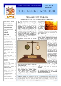 Special points of interest: 9th AGM & Lecture 4 S East Regional Group 4 S West Regional Group 5 NMM/Kidbrooke Visit 6 Copenhagen Ceremonies 7 Glorious First of June 7 Nelson Legacy Series 8 NYC Pickle Night Dinner 8 Nile Captains Update 9 Sidney Smith’s tomb revisited 10 Chasing Freedom Exhibition 10 A Final Tribute 11 In Harbour: Partick Tull & Derek Gardner 11 12 Face-to-Face: Modern Images of Nelson 16 Alison’s Column NEW 17 Nelson Letters online: The War Times Journal 18 The Selbourne Library 18 British War Poetry 18 Nelson at Sotheby’s 22 Nelson’s First Memorial? 24 Chairman’s Dispatch 2 From the Quarterdeck 4 Forthcoming Events 7 N Z Feature continued 13 Ditty Bag 16 Webnotes 18 Book Notes 19 Collectors’ Corner 22 The KEDGE ANCHOR is the newsletter of The 1805 Club. It is published three times a year (in March, July and November) and is distributed free to members. For information about the newsletter contact the North American editors: Randy and Dana Mafit at 1980 Sunrise Blvd., Eugene, Oregon 97405, USA, phone +1 541-343-1894, email: randym1805@aol.com, or the UK editors Paul and Penny Dalton at Woodlands, Hankham, Pevensey, East Sussex BN24 5BE, UK, phone +44 (0)1323 764212, email: pd@pdpictorial.freeserve.co.uk. UK Edition INSIDE THIS ISSUE: THE KEDGE ANCHOR NEWSLETTER OF THE 1805 CLUB Issue No. 18 March 2007 NELSON IN NEW ZEALAND NELSON RELICS AT THE AUCKLAND CITY LIBRARIES A mong the treasures of the Department of Special Collections at Auckland City Libraries are items associated with Lord Nelson. A number of the relics were highlighted at an exhibition for the bicentenary of his victory and death at the Battle of Trafalgar on 21 October 1805. The exhibition, entitled “200 Years Ago: Expanding Horizons, Shrinking World,” was held on the Heritage Floor of the Auckland Central City Library from 14 August - 13 November 2005. It featured letters written by Lord Nelson, his watch, and the seal given to him by Emma Hamilton. Descriptions of the items are provided below. Watch given to Horatio Nelson by William and Emma Hamilton, 1799. The plaque on the front of the watch stand reads: Admiral Lord Nelson’s watch. A watch by Thomas Ivory, Dundee, in metal gilt case, the back engraved H.N. from W. & E. H. 1799, (top right) in shagreen outer case. Presented to Admiral Lord Nelson by Sir William and Lady Hamilton. Nelson had met Sir William and Lady Hamilton at Naples in 1793, but it was not until he convalesced in Naples in late 1798 that his relationship with Emma began. Their daughter Horatia was born towards the end of January 1801. The watch is a typical “verge” watch of the period. Verge escapement watches were the standard personal timekeepers of the period. The movement is gilt brass with baluster pillars and pierced balance cock typical of such watches. The regulator is Tompion style (disc with key square). The cock has a decorative diamond endstone. Shagreen is a form of dyed cured sharkskin, frequently used at the time on small personal articles. Moss Davis purchased the watch at Christie’s sale “Nelson and other relics” held on 17 June 1930. It was described as the “Property of a gentleman and formerly the property of the late Miss Pamela Hardy, great-granddaughter of the brother of Capt. Thomas Hardy, RN, from whom the objects had descended.” In a letter to John Barr, director of the Library and Art Gallery, Moss Davis wrote “... I feel sure that this memento will give particular pleasure to many in your City.” -continued on page 13 Feature Story-
