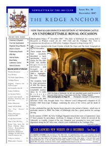 3 enduring nature of the attributes and qualities that still infuse the Royal Navy with its remarkable ethos, and helps to explain why Nelson is, in Mahan’s words, the very ‘embodiment of the Sea Power of Great Britain’. The ethos of the Royal Navy is defined as ‘the enduring spirit derived from our people’s loyalty to their ship, unit or team, sustained by high professional standards and strong leadership that gives us courage in adversity and the determination to fight and win.’ This is a way of life where the focus is on the people rather than ships in which they serve. The ethos recognises the importance of everyone in the command chain regardless of their rank or length of service. Moreover, its roots are clearly found in the letter Francis Austen wrote to his sweetheart, Mary Gibson, on 27 October 1805: ‘I never heard of his [Nelson’s] equal, nor do I expect again to see such a man. To the soundest judgement he united prompt decision and speedy execution of his plans and he possessed in a superior degree the happy talent of making every class of persons pleased with their situation and eager to exert themselves in forwarding the public service.’ Collingwood said, ‘We must endeavour to follow his example…’ The Royal Navy faces challenges that are peculiar to this unpredictable 21st century and its asymmetric brand of conflict, but Nelson’s legacy, and in the spirit of the restored toast to the Immortal Memory the spirit of all those who fell with him, demonstrates how good leadership sustains the ethos today. Following his example includes keeping things effective. Since my last Dispatch, a considerable amount of work has been done to revitalise the Club’s website. A refit was long overdue! We have employed Limeknight, a young and up and coming professional firm based at Portsmouth University, to help us redesign the architecture of the site so that it is more robust and capable of significant enlargement. This is particularly important as we begin to develop the educational side of the Club’s work through ‘living history’. The launch of the new site is set for 15 December and it carries a name that relates more clearly to the Club: <www.1805club.org>. Nevertheless, you will still be able to access it through our existing web address <www.admiralnelson.org>, but this will now stand alone as an information source about Nelson. One of the main features of the new site which we hope will be of real benefit to members, is the ‘members only’ area, which you will only be able to access through a password. Initially, this area will contain PDFs of past issues of The Kedge Anchor and articles from earlier editions of the Trafalgar Chronicle. However, we shall be adding to and updating the area on a regular basis and I am delighted that Josephine Birtwhistle is ready to take command of the new website in December. Moreover, members will be able to communicate with each other and engage in discussions with other members (see page 5) Communications were a little more arduous in Nelson’s day and as I write this Dispatch I am reminded that we are only a few days away from arguably the most prestigious event ever arranged by the Club: The celebration of the delivery of the news of the Battle of Trafalgar by post chaise to His Majesty King George III at Windsor Castle on 6 November 1805 at a reception in the Queen’s Guard Chamber at Windsor Castle in the presence of His Royal Highness The Duke of Edinburgh KG KT. The evening acknowledges the important link between the Royal Navy and carriage driving. To be at Windsor is a tremendous privilege for The 1805 Club and I am delighted that many members will be there to enjoy it. As one can imagine the demand was considerable and I am equally sorry for those who were unable to get tickets. All will recognise that a unique occasion like this raises the status of the Club and reinforces its ability to fulfil its charitable objectives. Looking forward to 2008 the Club is devising plans to celebrate the 250th anniversary of Lord Nelson’s birthday. These will include a civic dinner at Kings Lynn, a Nelson Birthday Concert at Burnham Thorpe, and a Service of Thanksgiving at All Saints Church, Burnham Thorpe. The dates are 26-28 September. Two weeks earlier on Saturday, 13 September the Club is arranging an international conference entitled The Collingwood Years: Naval Strategy against Napoleon 1806-1810 at HMS Collingwood followed by a dinner in the wardroom. Earlier in the year we are organising another conference entitled Anson's Voyage round the World and its Medical Aftermath at The Medical Society of London on Saturday, 7 June. Also with special thanks to its Director, Dr Colin White, the Club will be holding a fundraising dinner in the Nelson Gallery at the Royal Naval Museum for the conservation of Captain Henry Bayntun’s grave in Bath. The Club’s Trafalgar Dinner will be on Saturday, 18 October 2008. And there is much more (see p 15). It is going to be another busy year! As ever my thanks to Randy and Dana Mafit, Paul and Penny Dalton and our ‘contributing editor’, Alison Henderson, for this splendid issue of the Kedge Anchor – no longer a newsletter; now a news magazine! May I take this opportunity to wish you all a Merry Christmas and a very Happy New Year. With best wishes, Peter Warwick