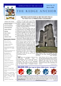 Continued on page 11 Special points of interest: Chairman’s Dispatch 2 From the Quarterdeck 4 Forthcoming Events 7 Feature continued 11 Ditty Bag 15 Alison’s Column 18 Book Notes 21 Collectors’ Corner 25 The KEDGE ANCHOR is the newsletter of The 1805 Club. It is published three times a year (in March, July and November) and is distributed free to members. For information about the newsletter contact the North American editors: Randy and Dana Mafit at 1980 Sunrise Blvd., Eugene, Oregon 97405, USA, phone +1 541-343-1894, email: randym1805@aol.com, or the UK editors Paul and Penny Dalton at Woodlands, Hankham, Pevensey, East Sussex BN24 5BE, UK, phone +44 (0)1323 764212, email: pd@pdpictorial.freeserve.co.uk . UK Edition INSIDE THIS ISSUE: Nelson 250 Logo 3 AGM 10 & Lecture 4 International Journal of Naval History reviews The Trafalgar Captains 6 Regional Group Reports and Forthcoming Events 6 Re-dedication of Lapenotiere Tomb 7 Glorious First of June 7 Anson Conference 8 Bayntun Dinner 8 Collingwood Conference 9 Nelson 250 Celebrations 9 Cannon returns to Greenwich 15 Boulton’s Trafalgar Medal 16 Chatham Historic Dockyard Society. 20 Books on: 17C shipmodels, Thomas Cochrane, Oxford Encyclopedia of Maritime History, Arming the Fleet, War of 1812, USS Constitution, etc. 21 Collectors’ Corner Extra 28 RNM Pocock Conference 10 Awards to Colin White and Brian Lavery 5 THE KEDGE ANCHOR NEWSLETTER OF THE 1805 CLUB Issue No. 21 March 2008 SIR WILLIAM PAXTON & HIS NELSON FOLLY The Nelson Tower at Middleton Hall, Carmarthenshire Paxton’s Tower first came to your editor’s attention in a BBC online headline in late September, 2006 which announced “Nelson’s tower blackout mystery -- A Carmathenshire landmark honouring Lord Nelson has been plunged into darkness during an electricity bill row.” The tower, a 19th Century Gothic “folly” and banqueting hall on the Middleton Hall estate above the Tywi (Towy) Valley, had been illuminated at night since the 1970s. The local Council, responsible for the electricity bills, had not paid a penny since 2002 due to disputed charges. When the lights went out they thought the power had been cut off. The Council claimed it had not received any bills for months. When one finally arrived it was based on an estimated reading and was for an amount far in excess of what should be due. The electricity company, BizzEnergy, said the over-estimated bills were due to wrong information from its data collector and revised ones were in the post. A spokeswoman for the electricity company also claimed that they had not turned the power off. A council clerk said the bulbs, fuses and other equipment would be tested to see if they were at fault so the tower could be lit up again. She also said if a bill matching the tower’s meter reading arrived the council would pay it. Oddly, the resolution (if there was one) has not been subsequently reported. W hat no one can dispute is that one of the most spectacular vistas in Carmarthenshire can be viewed from Paxton’s Tower. From the top of the folly, you are rewarded with views of the surrounding countryside. Dominating the landscape to the east is the Dinefwr Estate, a designated National Nature Reserve with its ancient woodland, deer park and flood pastures that are home to many water fowl. To the west is the rest of the Middleton Hall Estate and the National Botanic Garden of Wales. The story of this monument is curious, and as interesting as its scenery. NELSON 250: New Logo for Nelson 250th Events - see page 3 Paxton’s (Nelson’s) Tower on the Middleton Hall Estate overlooking the Twyi Valley, Llanarthne, Carmarthenshire, South Wales. Photo: Sean Bolton.