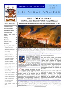 Plate XXXVIII from Campi Phlegræi... In a night view of 11 May 1771, Hamilton is seen escorting their Sicilian Majesties to a part of Vesuvius where the lava fell down a perpendicular drop before flowing toward the town of Resina. The plate description states that: “the original drawing for this plate was taken that night on the spot” - in fact, Peter Fabris has included himself sketching in the bottom left hand corner. Reprinted with kind permission of the Glasgow University Library Department of Special Collections. The Hunterian copy of Campi Phlegraei (Hunterian Bm.1.1-2) was featured as the ‘Book of the Month’ on the website of the Special Collections Department of the Glasgow University Library in October 2007. The following article, written by Ellen Cole, provides background about the book and its production. The Hunterian Collection is the best known of Glasgow University’s rare book collections. Our appreciation to the Special Collections Department for allowing us to reprint the following article in full. Chairman’s Dispatch 2 From the Quarterdeck 3 Regional Group Reports 10 Forthcoming Events 12 Feature - Fields of Fire continued 16 Ditty Bag 19 Book Notes 24 Collectors’ Corner 28 Web Notes 30 Special points of interest: INSIDE THIS ISSUE: AGM/Members’ Day 3 Lapenotiere Rededication 4 GFJ at Langar 5 Anson Conference 6 The Bayntun Dinner 7 Where Nelson Died…? 8 ‘Turmoil & Tranquillity’ Exhibition at NMM 14 Admiral Fancourt’s Grave 16 The Wreck of the Ontario 19 Nelson Gold Box Goes to Oxfordshire Museum 21 Bullring Planners Reject Electronic Blight 21 £20m Donation to NMM 22 A New Visage of Nelson 23 US Naval Officers in 1812 30 NARA Naval Inventory 30 Two Historical Naval Resources Online 31 Campi Phlegræi Colour Plates 32 The Bust of Quilliam 15 The KEDGE ANCHOR is the newsletter of The 1805 Club. It is published three times a year (in March, July and November) and is distributed free to members. For information about the newsletter contact the North American editors: Randy and Dana Mafit at 1980 Sunrise Blvd., Eugene, Oregon 97405, USA, phone +1 541-343-1894, email: randym1805@aol.com, or the UK editors Paul and Penny Dalton at Woodlands, Hankham, Pevensey, East Sussex BN24 5BE, UK, phone +44 (0)1323 764212, email: pd@pdpictorial.freeserve.co.uk . UK Edition THE KEDGE ANCHOR NEWSLETTER OF THE 1805 CLUB Issue No. 22 July 2008 FIELDS OF FIRE SIR WILLIAM HAMILTON’S Campi Phlegræi Observations on the Volcanos of the Two Sicilies (Naples, 1776) the Age of Enlightenment. The area around Naples was known locally as the Campi Phlegræi, or ‘flaming fields’, owing to the frequent and violent eruptions of Mount Vesuvius. From his country house at the foot of the volcano, William Hamilton (1730-1803) was ideally placed to witness and investigate the eruptions of the 1770s. The study of volcanic activity in the area had begun in earnest some 150 years previously. Attention was focused particularly on Vesuvius by the discovery of the Roman towns of Herculaneum and Pompeii in 1738 and 1748 respectively. -continued on page 16- C ampi Phlegræi documents the late eighteenth century eruptions of Mount Vesuvius. Written by Sir William Hamilton, Britain's envoy to the Spanish court at Naples, this rare book contains fifty-four spectacular hand coloured plates by the artist Peter Fabris. It is a wonderful example of a beautifully illustrated scientific treatise from