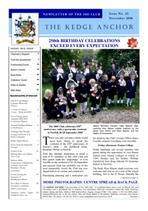2 CHAIRMAN’S DISPATCH: A Birthday To Remember E arlier this year I happened to be in Poland and arranged to meet the former president and leader of Solidarity, Lech Walesa. The aim was to highlight the coincidence of his birthday, which falls on 29 September, Nelson’s birthday! It was a bright sunny morning when I arrived at his office at the famous Green Gate in Gdansk. Initially he was surprised that I had even bothered to see him because, while he knew about Lord Nelson, he said he couldn’t even swim! However, when I replied, “Nor could Nelson!” his eyes lit up. So now they had two things in common. He then pointed out that he “wasn’t a war fighter”. While I had to agree on the technicality that he hadn’t made his career the armed services, I emphasised that he had fought a different sort of ‘war’, and moreover one that highlighted the two fundamental similarities he shared with Nelson: moral courage and humanity. Now I really had his interest! He was flattered and also a little embarrassed when I pointed to his own bravery and moral courage in first clambering over the gates into the Gdansk shipyard, and subsequently standing his ground for what he believed in until victory was achieved. His tinge of embarrassment converted to genuine humility when I highlighted his own humanity – the singular word that also defines Nelson. And so he agreed that he would come to Britain for Nelson’s 250th birthday celebrations in Norfolk if a slot could be found in his full diary. It was not to be, but the meeting not only introduced him to The 1805 Club, it also showed how Nelson’s words at the end of his Sketch of my Life, “Go thou, and do likewise”, are as relevant today as they ever were, for in his own way Lech Walesa had indeed done likewise. NELSON 250 was an amazing success and I don’t imagine anyone who came to Burnham Thorpe for the Thanksgiving Service, whether members, guests or residents, will ever forget this unique celebration in the tiny village set in countryside that is little changed from what it looked like all those years ago. They will recall the charming performance by Burnham Thorpe’s young children, the Dean of Norwich’s expressive sermon, the large turnout and the very smart guard provided by the Sea Cadets. The Guard was inspected by Admiral Sir Mark Stanhope, Commander-in-Chief Fleet, who with Lady Stanhope, joined the Club for the whole weekend. He was also Guest of Honour at the splendid civic Birthday Dinner in Lynn’s historic Town Hall. Our thanks go to everyone else who took part and helped to make this national celebration the success that it was, not least the Mayor, councillors and officers at King’s Lynn, the commanding officer and crew of HMS Raider for their initiative and special visit to King’s Lynn, and the splendid Fermoy Gallery for its stunning Nelson Exhibition. Without doubt this year’s events programme has been exceptional, with the Club arranging eight major events in addition to NELSON 250. Many Council members have been involved in their preparation, but I should like to thank Barry Coombs, the keystone for most of them, for his resilience, good humour and wonderful organisational skill throughout. Next year we shall enjoy a slightly quieter programme as we gear up for the Collingwood commemorations in Newcastle in March 2010, but there are a number of attractive events in the pipeline culminating in October with the Club’s Trafalgar Dinner on the 17th. Our final event for 2009 will be the Wreath Laying Ceremony at St Paul’s Cathedral on Trafalgar Day itself, which we now co-organise with the Royal Navy and Marine Society and Sea Cadets. All members will receive an invitation to this. The Club had the honour of redesigning this year’s ceremony and well over 70 people attended. You will find a more detailed report of the occasion in this Kedge Anchor. Also, starting with this issue, is a regular report from Council; an overview of our discussions which we hope will give you a better idea of how we ‘run’ your Club. In my last Dispatch I described how The Nile and Copenhagen Captains Memorial is the next major conservation project of the Club. As with the Trafalgar Captains we are keen to involve our members and as you will see from the separate article in this issue (see page 4), we are calling for volunteers to visit the graves to carry out preliminary surveys, including photographs. I am pleased that thanks largely to the painstaking research by Club Secretary John Curtis we have been able to identify virtually all of them but we still need members to confirm our information and to check their condition. We have published their whereabouts in the Members Area of the website, but are also listing them here. We earnestly hope that we shall find a ‘fine sett of fellows’ to help us with this essential work. Please contact John, who will give you more details and the survey guidelines. Talking of fine fellows, I should like to take this opportunity to thank Sim Comfort for the support he gave to the Bayntun Dinner in July, and in particular for the production of the keepsake, which he has since reproduced for all our members and which you will find enclosed with this copy of The Kedge Anchor.