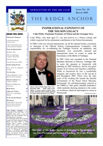 THE KEDGE ANCHOR NEWSLETTER OF THE 1805 CLUB Issue No. 24 March 2009 THE KEDGE ANCHOR is the newsletter of The 1805 Club. It is published three times a year (in March, July and November) and is distributed free to members. For information about the newsletter contact the North American editors: Randy and Dana Mafit at 1980 Sunrise Blvd., Eugene, Oregon 97405, USA, phone +1 541-3431894, email: randym1805@aol.com, or the UK editors: Paul and Penny Dalton at Woodlands, Hankham, Pevensey, East Sussex BN24 5BE, phone +44 (0)1323 764212, email: pd@pdpictorial.freeserve.co.uk. UK Edition Colin White, who died aged 57, was best known as a Nelson scholar and widely respected for his substantial contribution to the Nelson bicentennial. In 2000, Colin was elected unanimously, by all the national bodies concerned, as chairman of the Official Nelson Commemorations Committee, with responsibility for co-ordinating the Trafalgar Festival, an ambitious, and ultimately very successful, national and international series of events to mark the bicentenary of the Battle of Trafalgar. In 2001 Colin was seconded to the National Maritime Museum as Director, Trafalgar 200, to assist the museum at Greenwich with planning its 2005 initiatives, and he was guest curator of its Nelson and Napoléon exhibition. While at Greenwich he was a wonderfully energetic and creative force in the run-up to and throughout 2005. These were the only years of his working life outside the familiar environment of the Royal Naval Museum, Portsmouth. He self-deprecatingly referred to the NMM as “this great, national institution” while modestly drawing attention to the centre of excellence which he had helped to create at Portsmouth. INSPIRATIONAL EXPONENT OF THE NELSON LEGACY Colin White: Passionate Promoter of Nelson and the Georgian Navy This issue of The Kedge Anchor is dedicated to the memory of our Vice-President and former Chairman, Dr Colin White. Continued on page 4 Above: Colin at Pickle Night, New York, November 2008. Photo: Alison Lucas Below: A crocus anchor outside Portsmouth Cathedral where friends gathered for Colin’s memorial service on 2 March. Chairman’s Dispatch 2 Colin Remembered - in New York 7 Colin’s Memorial Service at Portsmouth Cathedral 8 From the Quarterdeck 9 Members’ Day 9 Nile & Copenhagen Captains’ Memorials 11 Saumarez Plaque 12 Funeral Procession Walk 13 Forthcoming Events 14 News from the Regional Groups 15 The Ditty Bag 16 Admiral Balchen’s Victory discovered off Alderney 18 Alison’s Column with Andrew Lambert 20 Book Notes 23 Collectors’ Corner D F Loos: Copenhagen Medals 27 In the Auction Rooms 28 Web Notes Caird Library Access and Service hours restricted during redevelopment 31 Belleisle’s Trafalgar Log Auctioned 22 INSIDE THIS ISSUE: