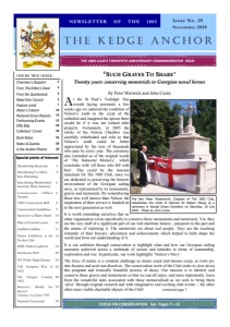Andrew Lambert gave a superb talk on The War of 1812, highlighting the action between the HMS Shannon and USS Chesapeake, and the flower table decorations, generously arranged and provided by Kathy Clark, were simply stunning. While immensely enjoyable in their own right, occasions like the Trafalgar Dinner remind us of the conservation work we undertake and I congratulate the editors of the Kedge Anchor for the focus in this issue they have given to our conservation activity past, present and future. It has been a rewarding twenty years and the Council is keen to lay foundations that carry the Club forward into the next twenty years, in particular, fundraising. One fundraising idea we propose launching next year is a register of Top Men (or Women) who have agreed to raise £100 each year for the next five years for the Nile and Copenhagen Captains’ Memorial Project. Top men were sailors who worked on the highest sails, which gave them peer prestige. On completion of the task your name will be entered on the 'Nile and Copenhagen Roll of Honour', which will be produced as a special certificate for you to have at home. An electronic version will be located within the Club’s website. You will, therefore, be associated with both battles and the conservations for evermore. Your views on this idea will be very welcome, so please feel free to email me at < peterwarwick@compuserve.com >. Another essential component of The Nile and Copenhagen Captains’ Memorial is the requirement for a Conservation Officer to help Council to oversee the programme. A brief description of the sort of things this role is expected to involve is featured in the conservation section and we very much hope that it is something that will appeal to one of our existing members. You will also see a notice for the commemorative mug we have produced to celebrate the Club’s first twenty years conserving the memorials to Georgian naval heroes. It is an elegant design and has been manufactured by Aynsley, one of the oldest surviving potteries in this country, founded in 1775, when Nelson was invalided home from the East Indies suffering from Malaria. The mugs are a limited edition of 150 and are we believe very reasonably priced at £10.00 each, with two pounds per mug going to support the work of the Club. They also make excellent Christmas stocking fillers! With best wishes, including a very Merry Christmas and Happy New Year to you all, Peter Warwick Chairman The KEDGE ANCHOR is the newsletter of The 1805 Club. It is published three times a year (in March, July and November) and is distributed free to members. For information about the newsletter contact the North American editors: Randy and Dana Mafit at 1980 Sunrise Blvd., Eugene, Oregon 97405, USA, phone +1 541-343-1894, email: randym1805@aol.com ; or the UK editor Ken Flemming, 15 Southlands Drive, Leyland, Preston Lancs PR26 7SJ, UK , phone +44 (0)1772 433970, email: kenflemming@sky.com . UK Edition 2011 MEMBERSHIP RENEWALS DUE Membership subscription renewals for 2011 are due on January 1st. A renewal form was enclosed with the 2010 Trafalgar Chronicle. Your continued membership in the 1805 Club is very important to us—your participation and subscription support a variety of club activities including monument conservation/restoration, the organization and staging of commemorative events, and the publication of the Trafalgar Chronicle, the Kedge Anchor and other publications. We encourage you to renew your membership and hope that you continue to find it worthwhile. Again this year, we are inviting those of you who would like to make an additional contribution to the conservation work of the club (above and beyond your annual subscription) to include it with your dues. If you wish to donate for this purpose you should tick the appropriate box on the renewal form. You may designate any amount and your donation will be duly recorded. It may be listed on a conservation project in the future, unless you would prefer anonymity. The annual subscription is £35.00, with cheques made payable to “The 1805 Club.” For North American and Caribbean members the annual subscription is $70.00US (if paid before January 1st). After January 1st members need to send $70.00 + $30.00 conversion/draft fee for a total of $100.00. North American and Caribbean members should forward their checks in US dollars made payable to our North American Secretary, R. Burdett Mafit, at the address provided on the renewal form. The North American Secretary will convert all the checks into one sterling draft, thus saving the Club time and conversion charges. If you joined after 30th September 2010, or have already paid, please disregard this notice.