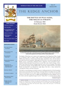 The KEDGE ANCHOR is the newsletter of The 1805 Club. It is published three times a year (in Spring, Summer and Autumn) and is distributed free to members. For information about the newsletter contact the Editor: Ken Flemming, 132 Slater Lane, Leyland, Preston, Lancs PR26 7SE, UK phone +44 (0)1772 302593, email: kenflemming@sky.com or Consulting Editor: Randy Mafit, 1980 Sunrise Blvd., Eugene, Oregon 97405, USA, phone +1 541-343-1894, email: randym1805@aol.com NEWSLETTER OF THE 1805 CLUB the kedge anchor Issue 41 Autumn 2014 THE BATTLE OF PULO AURA, THE MALACCA STRAITS 14 February 1804 Randy Burnett Mafit The Battle of Pulo Aura was a minor naval engagement of the Napoleonic Wars, fought on 14 February 1804, in which a large convoy of Honourable East India Company (HEIC) East Indiamen, well-armed merchant ships, intimidated, drove off and chased a powerful French naval squadron. Although the French force was much stronger than the British convoy, Commodore Nathaniel Dance’s aggressive tactics persuaded ContreAdmiral Charles-Alexandre Durand Linois to retire after only a brief exchange of shot. Dance then chased the French warships until his convoy was out of danger, whereupon he resumed his passage towards British India. Linois later claimed that the unescorted British merchant fleet was defended by eight ships of the line, a claim criticised by contemporary officers and later historians. The battle occurred during an extended commerce raiding operation by a French squadron led by Linois in the ship of the line Marengo. Linois had sailed to the Indian Ocean in 1803 before the declaration of war, under orders to install garrisons in the French and Dutch colonies in the region and to prey on lightly defended British merchant shipping. One of the richest and most significant targets was the “China Fleet”, an annual convoy of East INSIDE THIS ISSUE Chairman’s Dispatch 2 From the Editor 3 The Gog Magog Shutter Telegraph Journals 8 Letters to the Editor 24 NMRN Research Schedule 26 From the Auction Rooms 28 Book Notes 35 Special points of interest: Torin Lloyd’s Patriotic Fund Sword 11 Battle of Caulk’s Field re-enactment 14 Emma Hamilton: Wirral Visit 16 Menorca Naval Historical Conference 18 Conservation and Restoration of three Naval Memorials 20 Newhouse, Wiltshire 22 The Quest for Longitude 25 British Maritime History Seminar Series 27 Trafalgar Day 2014 – Portsmouth and Edinburgh 40 Continued on page 4 The China fl eet heavily laden commanded by Commodore Sir Nathaniel Dance beating off Admiral Linois and his squadron the 15 February 1804 by Thomas Butterworth