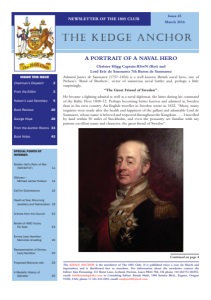 3 Issue 45 – March 2016 THE KEDGE ANCHOR AMA DataSet Limited are pleased to be associated with both The Kedge Anchor and The 1805 Club. AMA DataSet Limited, 5 School Lane, Bamber Bridge, Preston PR5 6QD Telephone 01772 627534 www.ama.uk.com FROM THE EDITOR Efficient business planning plays a significant part in any organisation that is to continue to be successful. For the Club to remain financially robust it is important to retain continuity. Council have formed a sub-group of council members with the expertise to achieve its long term stability. One measure has been a careful review of its publications and in part, how we deliver The Kedge Anchor. The magazine will maintain much the same layout but move to two issues per year, to be published in March and September. Each edition will increase from forty pages to forty eight. This will achieve considerable savings in publication and postage costs while retaining its greater value as a recognised newsletter and journal. Other plans are being made to update the Club website, funding the education programme and a rethink on its conservation policy for the long term benefit without the need for ‘returning’ conservation. The future conservation projects; improvements to the website; the importance of our North American membership; the future for The Trafalgar Way; the development of the educational programmes, and the question of cash flow not least because the current cycle of the worthwhile Topman Scheme is drawing to a close. It is my wish that the Topman scheme will be invigorated and that those who can renew their pledge will do so and be joined by new Topmen. We look forward to reporting on all of these issues in full at the AGM during the Members’ Day on Saturday 14 May. This year we are in Portsmouth at HMS NELSON Wardroom and may I remind members that they are very welcome, nay encouraged, to bring guests in order to introduce them to the Club. The Cecil Isaacson Memorial Lecture is being given by James Davey, Curator of Naval History at the National Maritime Museum. The United Wards’ Club of the City of London, is holding its annual President’s weekend at Portsmouth and working in close association with them we are delighted, thanks to our membership secretary Barry Scrutton (United Wards’ President in 2016!) to offer members many optional additional attractions that give you the opportunity to maximise your visit to Portsmouth, including the Historic Dockyard, HMS NELSON Wardroom and Fort Nelson. With all good wishes, Yours aye, Peter Warwick, Chairman Please note the next edition is due in September. The deadline for copy will therefore be 21 August 2016. We will be pleased to receive your ideas and contributions at an early date. North American secretary Captain John Rodgaard USN Ret continues with his first-rate electronic newsletter that keeps the North American Station updated. Particulars of which can be found in Articles from Council. This, the first forty eight page issue, contains regular columns and the not so familiar items. It was disappointing once published to find the picture quality of the last issue (KA44) poor with many illustrations appearing dark. The editorial team work hard to produce picture clarity, not an easy task when most are subject to copyright and consequently difficult to obtain in the original. Christine Beatty at AMA DataSet has carried out fine work with all illustrations for the issue, their placing, size and colour. Randy Mafit the consulting editor has also achieved excellent picture reproduction. These methods and talks with the publisher will solve the problem. Some members will have spoken with Lord Eric de Saumarez and Captain Christer Hägg RSwN Ret at the Club’s past Trafalgar night dinners and will welcome their lead article. Also revealing is Club Vice President, Joseph F. Callo’s adroit letter in which he says: “Enter British author and retired Royal Navy Captain Peter Hore, who has created Nelson’s Band of Brothers” – “Hore adds a particularly thoughtprovoking point, an idea that quickly extends our perspective on Nelson. While hundreds of books have been written about him, there is comparatively little about most of his contemporaries, and yet it would be a mistake to isolate him from the system, which was the Royal Navy, the most sophisticated administrative enterprise and largest industrial complex in the world.” Author Peter Hore has included an errata to the book which is published alongside the letter. It is important to encompass change and move forward, particularly with publications which are seen as the face of the Club. I believe this new stage will be successful and will give the Club an opportunity to also present occasional publications and papers. Kenneth Flemming