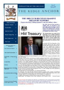 2 THE KEDGE ANCHOR Issue 47—Spring 2017 Success to The 1805 Club! “First Gain the victory and then make the best use of it you can.” Horatio Nelson 1798 I wrote in my last Dispatch, This is an exciting time for The 1805 Club because after 25 years of activity, which has consolidated its credibility and reputation, the Club, like the country [post Brexit], is at a threshold. Your Council has been working to respond to the challenges and opportunities this presents and in addition to the changes to the Trafalgar Chronicle it is investing in a revamp of the website, led by Jo Birtwhistle, which will allow for the long-awaited Memorials Log to be published on line. We have also commissioned a feasibility study from Commander Garry Spalton RN rtd on a future strategy for The Trafalgar Way. The 1805 Club is now the official custodian of the Trafalgar Way and we are thrilled that Ride the Trafalgar Way is taking place in October. We shall be presenting The New Trafalgar Dispatch to the winning cyclist of each leg. We are also looking at ways to help support this splendid event in future years together with many other organisations along the Way who we are approaching to help us raise its profile. Bill White is masterminding this. Hitherto we have fulfilled our charitable objectives in a variety of ad hoc ways but there is now a call for a sustained approach that will build on these achievements and integrate the various co-related elements. The underpinning themes remain conservation and recording, education and the promotion of naval heritage. These aspirational words are worth repeating in full because Council also recognized that integrating these elements would release synergy and elevate the Club’s performance, productivity and profile. However, it could only meet this challenge with a significant boost to its resources, otherwise it would always be struggling to realise its true potential. I am now exceedingly pleased to announce that an application for funds to the Chancellor of the Exchequer has been extraordinarily successful! The 1805 Club has been awarded the incredible sum of £455,000. The Libor Fund was created from the criminal fines imposed on banks for a series of fraudulent actions connected to their manipulation of the London Interbank Offered Rate, the average interest rate calculated through submissions of interest rates by major banks across the world. The fines amounted to hundreds of millions of pounds and in 2012 the Chancellor of the Exchequer announced that the proceeds from Libor fines should be used to support those that represent the best of values, in particular military and emergency services charities and other related good causes. At approximately this time last year the Club made its initial overtures, was deemed to qualify, and at the request of the Chancellor prepared its business case. There was no guarantee that the application would be successful. I hope you can imagine the surprise and elation felt by Council when it received the news on 27 November 2016 that the submission had been approved! This grant of funds represents a huge step forward for your Club and how it now pursues its aims and activities. It is the most significant development since we became a charity and it is a fantastic way to open the chapter on the Club’s next twenty-five years. It is also a genuine recognition of our status as a member of the naval heritage family and significantly raises our game and profile in this community and beyond. We could not announce anything until we had received and agreed the Terms and Conditions and ratified acceptance, which Council did at its last meeting on 18 February. However, we wanted our members to be the first to hear of the good news and that is why it appears in The Kedge Anchor before anywhere else. We are indebted to Vice Chairman Bill White, who receives a huge vote of thanks from us all for masterminding the application and we congratulate him on its successful outcome. I have worked with Bill in the past on applications similar to this and I know how much work is involved, often to be unrequited – but not this time! It has been a fantastic effort by him and the successful outcome could not be sweeter. Now, for the first time he has written a Vice Chairman’s Dispatch for the KA, which reveals his motivations for his pursuit of Libor and his dedication to the Club generally. I shall use Nelson’s words, “Could anything from my pen add to the character of the Captains [in this case Bill], I would write it with pleasure, but that is impossible.” The application relates primarily to The Trafalgar Way, our educational ambitions, a memorials log and associated naval historical data sets, and a number of international conservation projects. More specifically the grant will be used: To facilitate the provision of naval history lectures by leading naval historians for Royal Navy personnel. To secure from their compiler two unique and at risk naval historical databases relating to naval personnel who served in the British fleet in the Napoleonic Wars and to host them on the Club website. Also, to expand and enhance the Club database relating to naval monuments and artefacts to be hosted on the Club website To conserve the rapidly deteriorating Marriage Register on the island of Nevis that contains Lord Nelson's marriage certificate; also to provide a humidity controlled display case for the conserved Register and a digital copy of the Register for wider use. To restore the partly ruined chapel and associated hall. At the Old Royal Naval Hospital on the Isla del Rey in the harbour of Mahon, Menorca. To establish an organisation under the aegis of the Club to promote and develop The Trafalgar Way with activities, including lectures, films, cycle challenges, events for horse drawn vehicles (a post chaise was used in 1805 to bring the original Trafalgar Dispatch to London), events involving schools, notably Wooden World Workshops, a