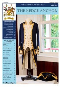 THE KEDGE ANCHOR SPRING 2025 1 SPECIAL POINTS OF INTEREST: Tribute to Jeremy Eddon 4 Nevis–Intro. 7 Nevis–Background 8 Nevis–Ceremonies 9 Nevis–Speech 12 Nevis–Holiday 14 Bill White– Re�lections 16 Bill White’s HOLT 17 Shipboard Music 24 ALNS Award 26 Thomas Slade 27 Metric System – US 28 Consul John Mitchell 32 Swords from HMS Royal George 33 Visit to DeBraak 36 Nearly Nelson 37 INSIDE THIS ISSUE THE KEDGE ANCHOR THE MAGAZINE OF THE 1805 CLUB Issue 63 SPRING 2025 Chairman’s Address 2 Secretary’s Report 3 Crossword 5 Job Announcements 6 Fund Raising 6 Events Diary 6 AB&OS 15 New Members 20 Book Reviews 21 Everybody Knows… 38 Cover Picture: See Page 3